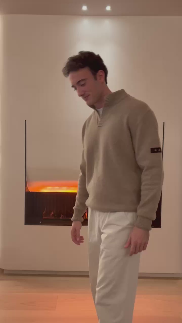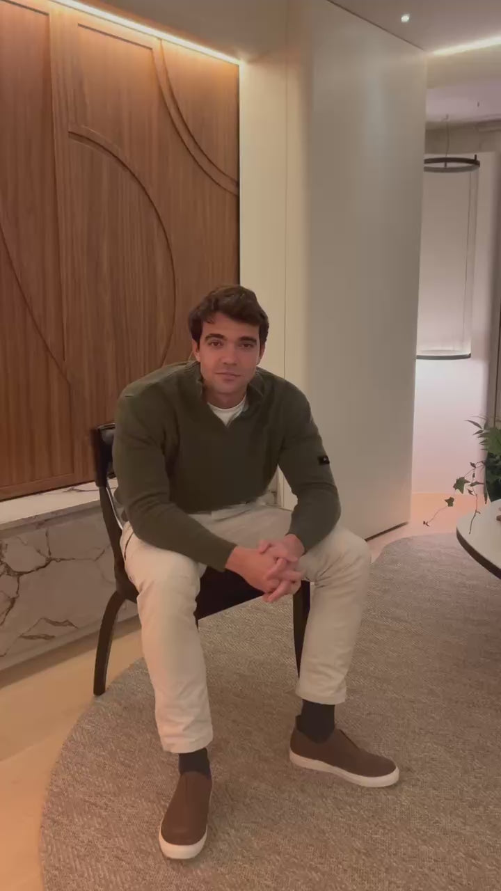 Jersey en lana merina. Diseño sin botones. Parche de terciopelo con logo bordado en la manga. Fabricado en España.